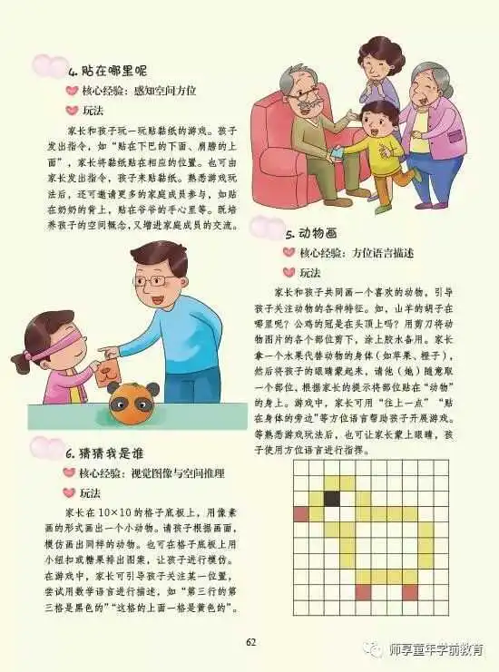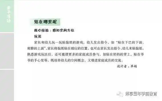 在《幼儿园教育指导纲要(试行)》中指出:“家庭是幼儿园重要的合作伙伴。应本着尊重、平等、合作的原则,争取家长的理解、支持和主动参与,并积极支持、帮助家长提高教育能力。”家庭教育在孩子的成长过程中起着很重要的作用,在《童心玩数学》教师用书中设有亲子活动的版块,指导家长如何和孩子一起在家中玩数学游戏。在幼儿用书中有亲子加油站的活动指导内容,也有与核心经验相配套的操作材料。