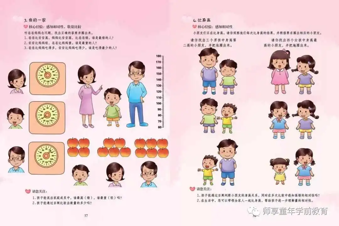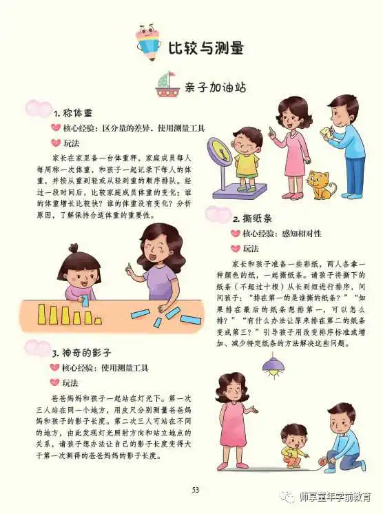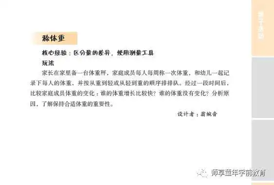 大班孩子可以玩哪些有意思的、和数学相关的活动呢?大班孩子可以使用一些工具,解决生活中的一些问题。在比较与测量板块,教师用书中有“称体重 ”亲子游戏指导;在幼儿操作材料中,在家可以玩的亲子小游戏有利用秤称体重,用尺测量纸条或者影子等。相配套的材料有“我的一家”,和爸爸妈妈一起来称体重、测量身高,然后进行比较。