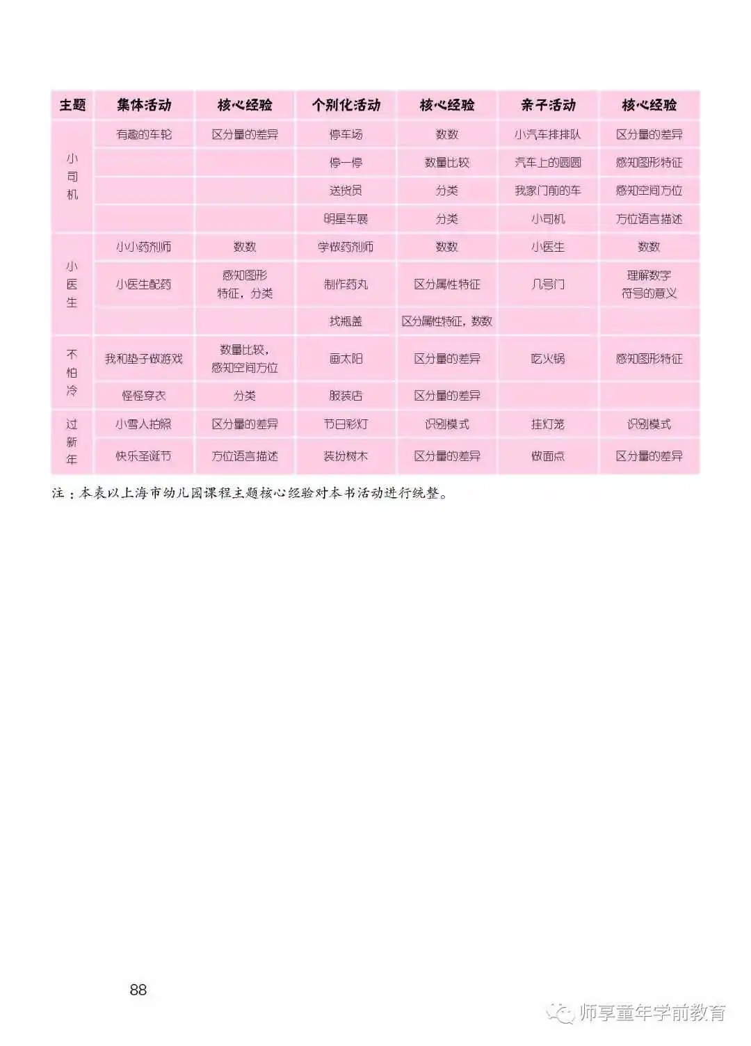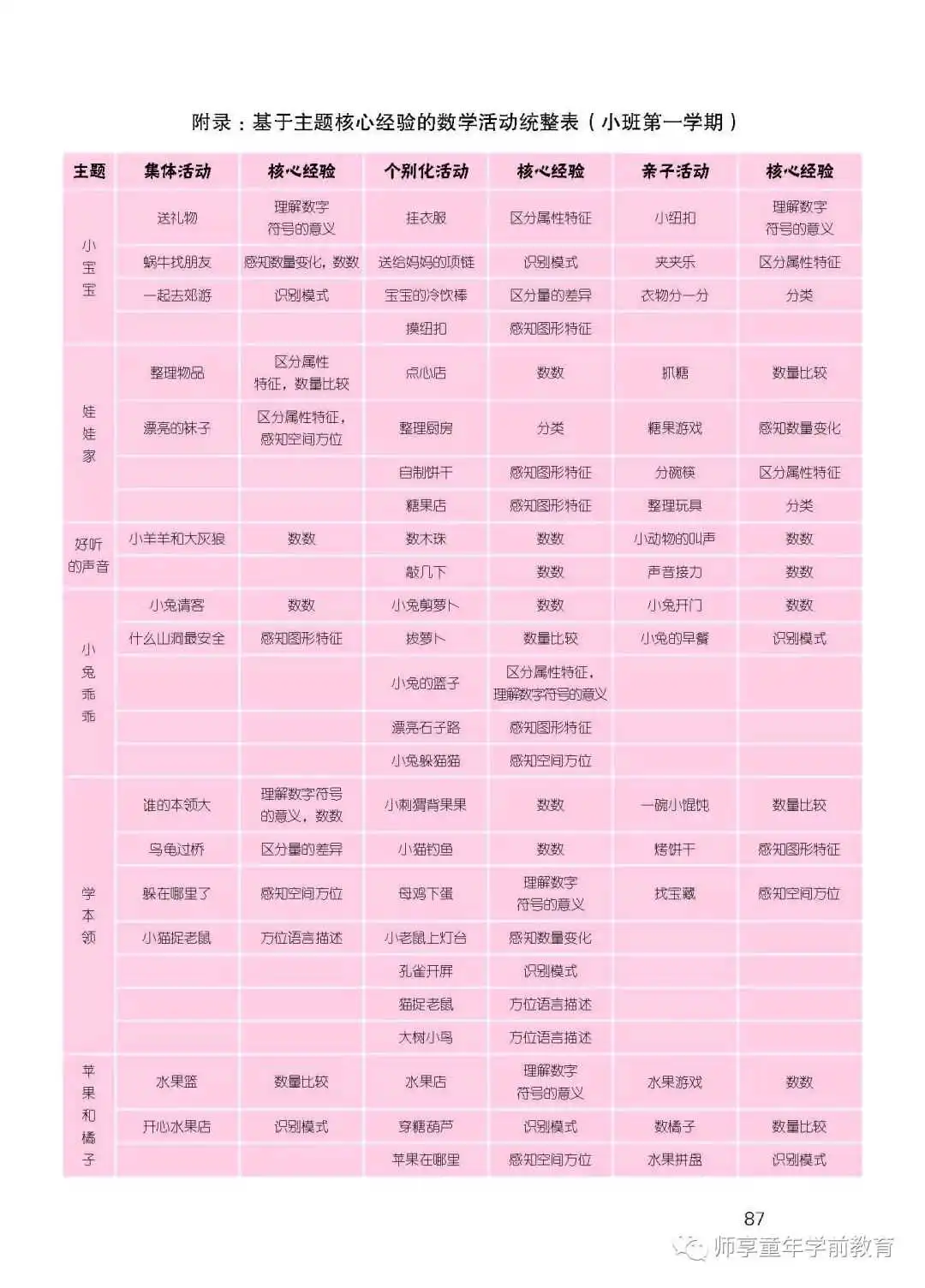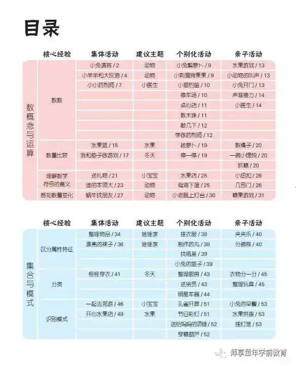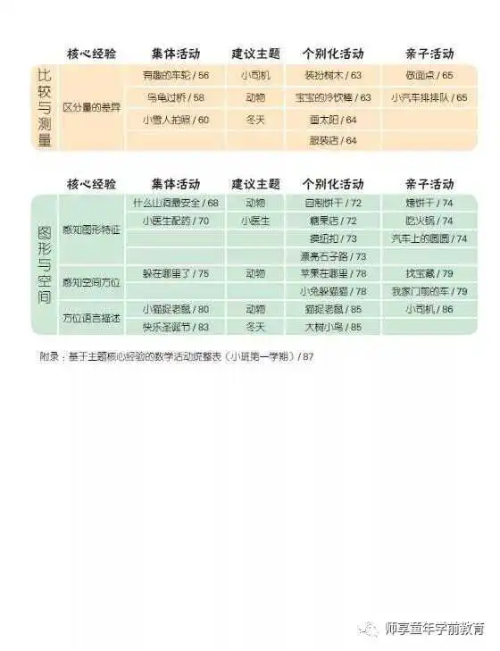 针对四大板块的数学核心经验,配有集体活动、个别化活动、亲子活动