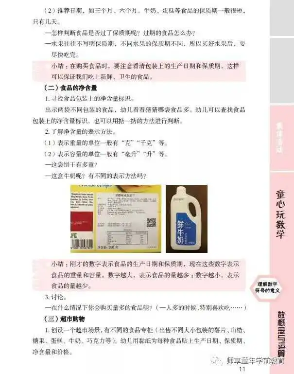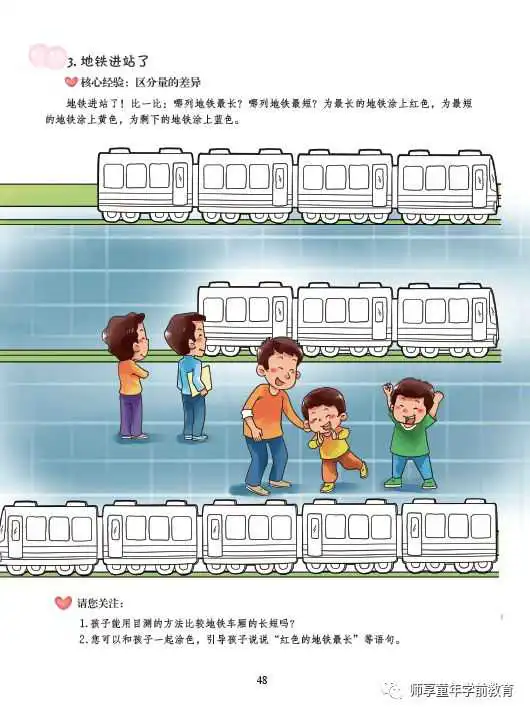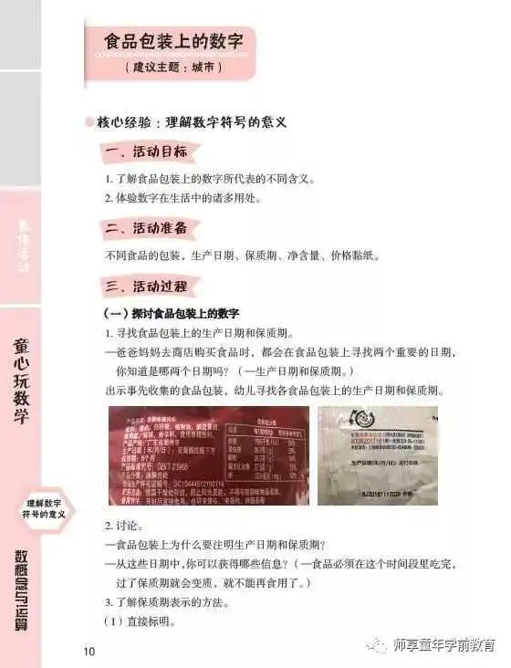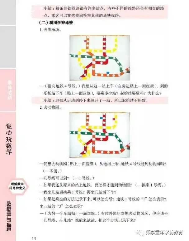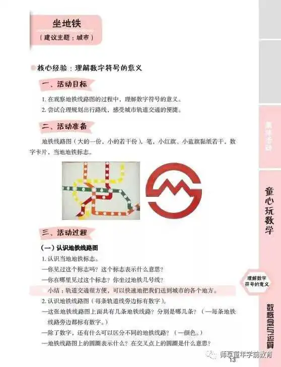 在大班活动中,有“食品包装上的数字”和“坐地铁”。“食品包装上的数字”活动的核心经验是理解数字符号的意义,让孩子了解保质期、净含量、生产日期等有用的数字。“坐地铁”活动的核心经验是理解数字符号的意义。地铁是非常重要的交通工具,孩子在观察地铁线路的过程中,感受轨道交通的便利。