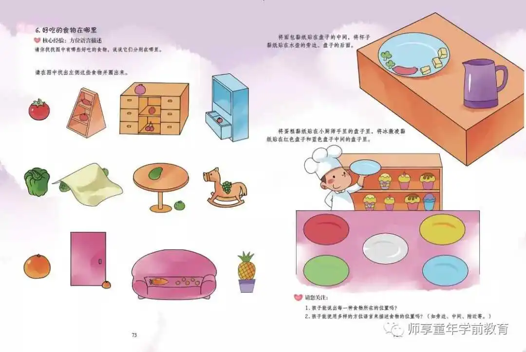 中班孩子可以玩哪些有意思的、和数学相关的活动呢?在图形与空间板块,教师用书中有“贴在哪里呢”亲子游戏指导;在幼儿操作材料中,孩子如何准确地描述出空间和方位?做一些小游戏,比如“贴在哪里呢 ”加上配套的操作材料“好吃的食物在哪里 ”,可以帮助孩子正确理解并表达出空间方位。