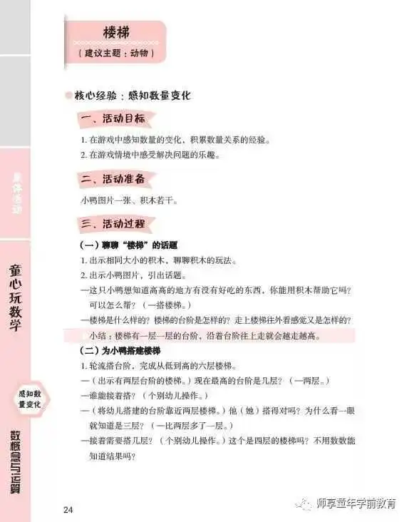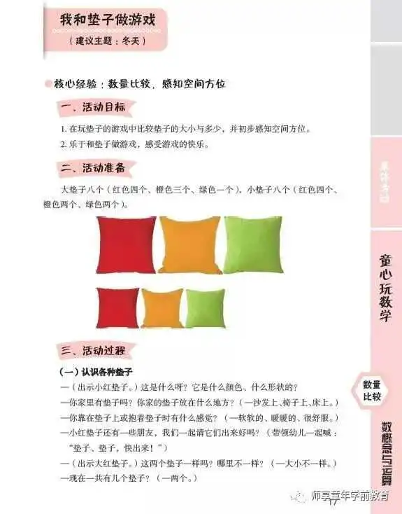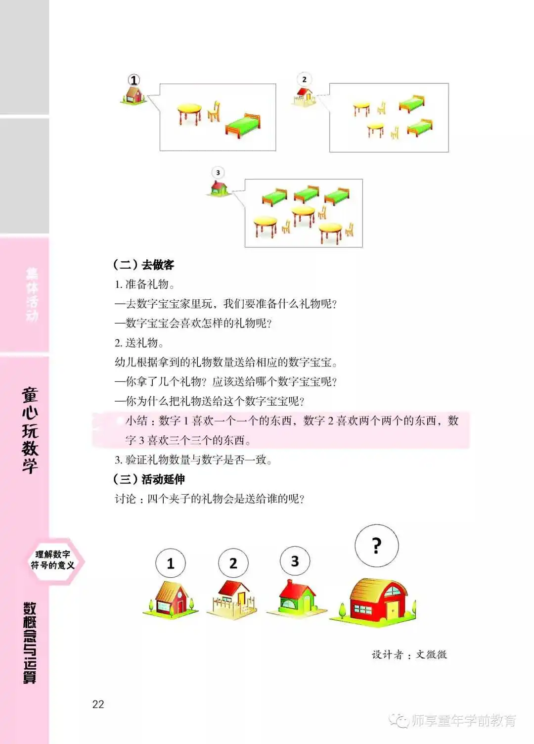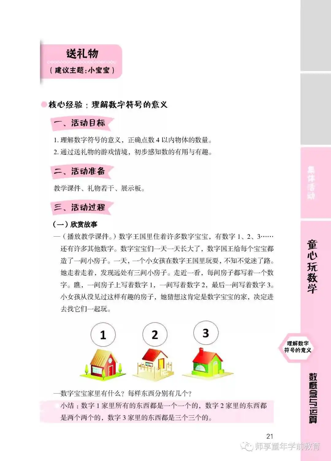 每个年龄段下有约20个集体活动,30多个个别化活动和亲子活动,这么多的活动完全能够满足老师一个学期的数领域方面的课时量。这些集体活动都是详案,需要用到的教具,都已经用图片提示出来。