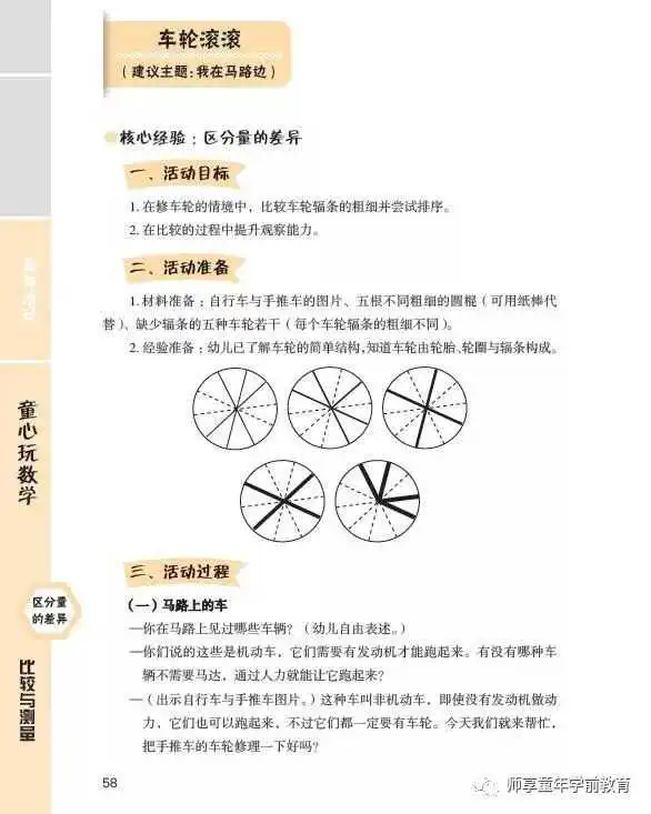 在中班活动中,有“楼梯”和“车轮滚滚”。“楼梯”活动的核心经验是感知数量变化。利用乐高积木帮助动物小鸭搭楼梯,在游戏的情境中感受解决问题的乐趣,从而积累数量关系的经验。“车轮滚滚”活动的核心经验是区分量的差异。通过比较车轮辐条的粗细尝试排序,孩子在比较的过程中提升观察能力。