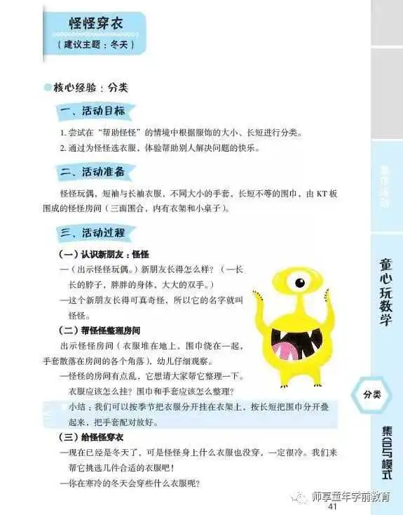 在小班活动中,有“水果篮”和“怪怪穿衣 ”。“水果篮”活动的核心经验是数量比较。通过点数5以内水果的数量,让孩子体验装水果和送水果,在游戏的过程中理解“1”和“许多 ”。“怪怪穿衣”活动的核心经验是分类。通过为怪怪穿衣服,体验帮助别人解决问题的快乐。