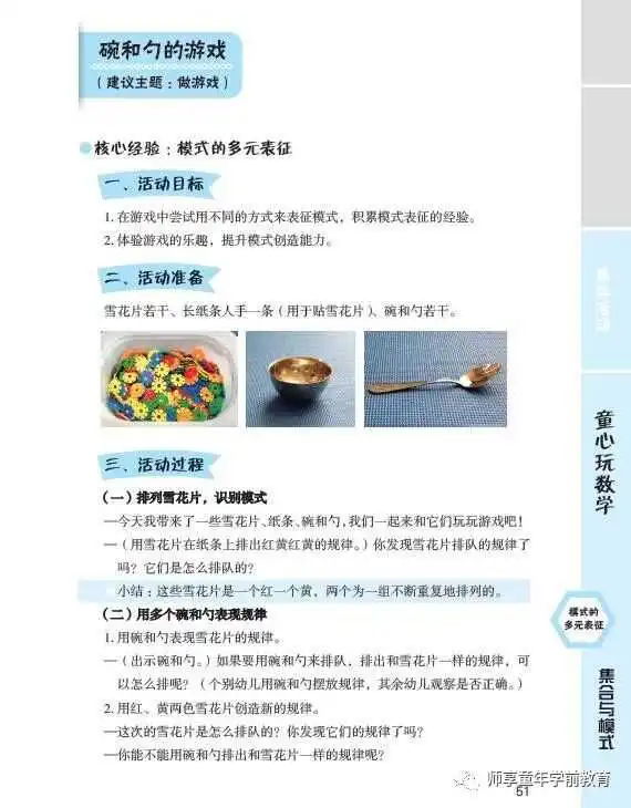在中班活动中,有“好朋友”和“碗和勺的游戏”。“好朋友”活动的核心经验是区分属性特征。孩子根据特征找到好朋友。“碗和勺的游戏”活动的核心经验是模式的多元表征。孩子用雪花片排出各种规律,用碗和勺敲出有规律的节奏。