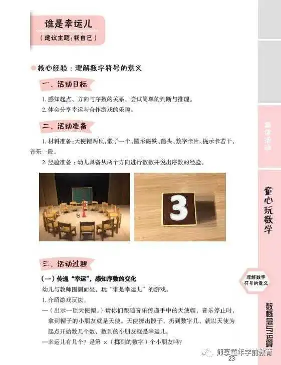 在大班活动中,有“谁是幸运儿”和“一起来转圈”。“谁是幸运儿 ”活动的核心经验是理解数字符号的意义。通过骰子、帽子、箭头、数字卡片等,教师和孩子一起玩游戏,在游戏的过程中感知数序变化和数字符号的意义。“一起来转圈 ”活动的核心经验是区分属性的特征。孩子可以根据不同的特征来玩站圈游戏。