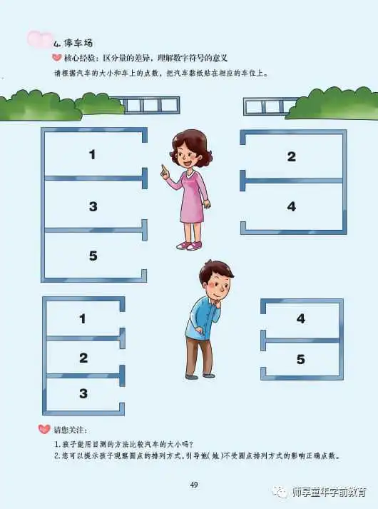 教师用书中的亲子活动部分,与幼儿操作材料相关联。亲子活动中的活动内容是教师指导家长如何在家中帮助孩子理解数方面的知识,锻炼孩子的思维。在幼儿操作材料中,有亲子小游戏和配套的操作材料。
