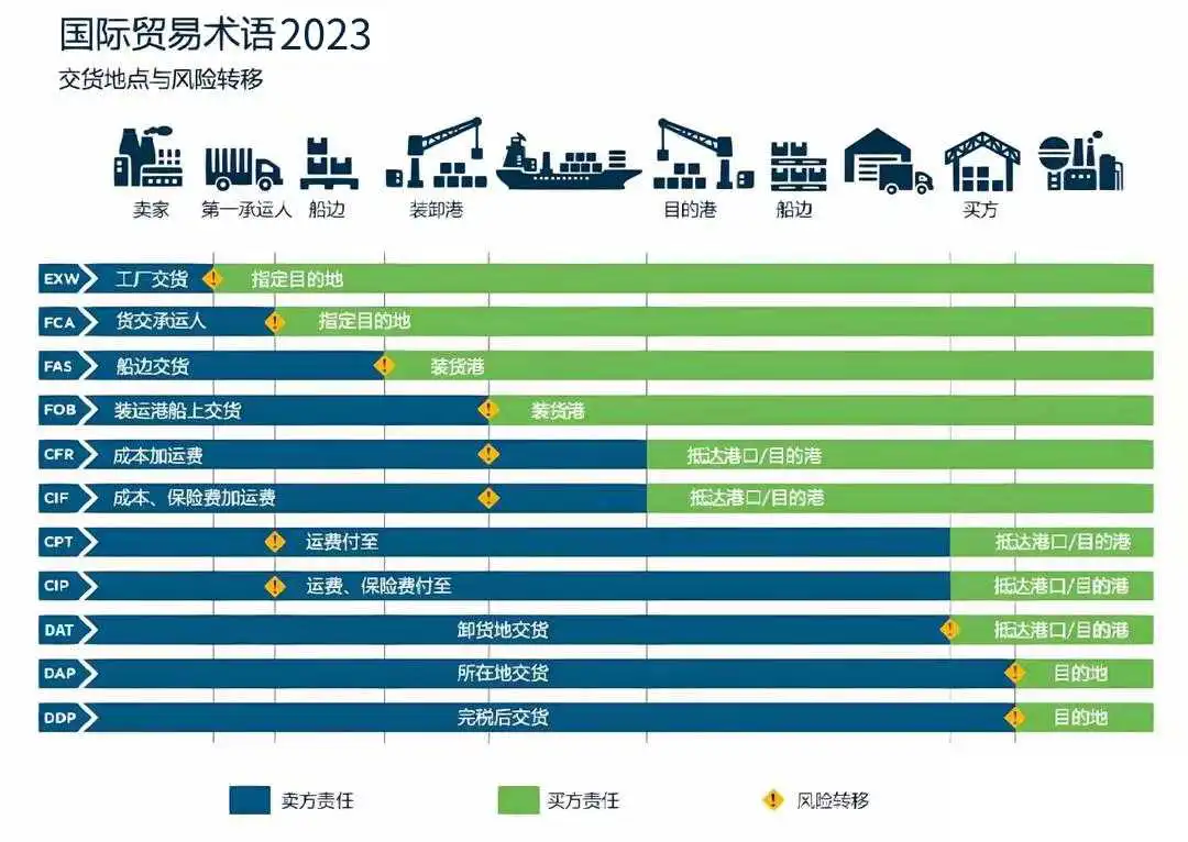 目前Incoterms2023对国际贸易术语具体划分11种,海关现行的成交方式代码为7种,其中常用的成交代码有4种。两者之间的对应关系: