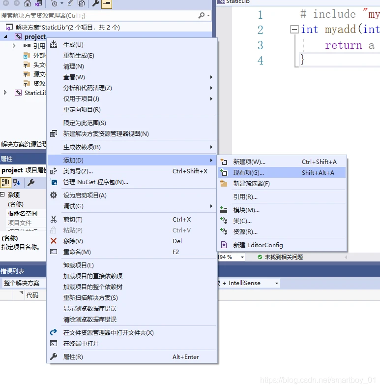 切换到"解决方案视图"选中要添加lib的工程–>点击右键–>“添加”–>“现有项”–>选择lib文件–>确定。