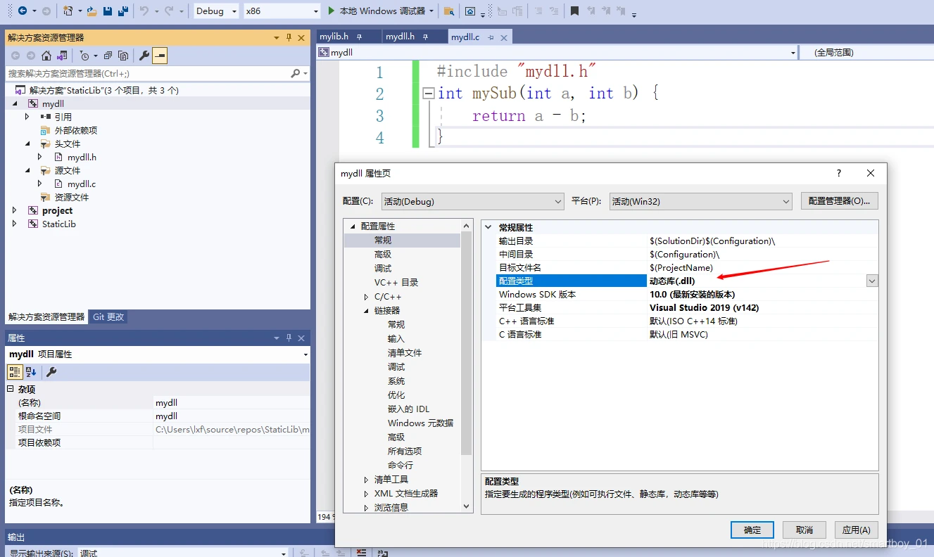 配置项目属性。因为这是一个动态链接库,所以应在项目属性的“配置属性”下选择“常规”,在其下的配置类型中选择“动态库(.dll)。