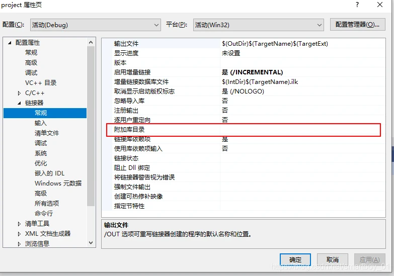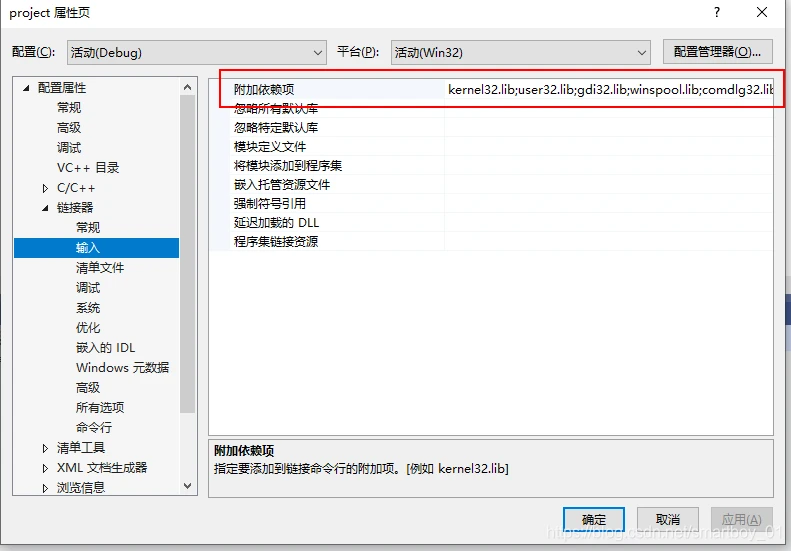 然后添加工程引用的lib文件名:工程—属性—配置属性—链接器—输入—附加依赖项:加上lib文件名。