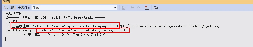编译生成新的解决方案,在Debug文件夹下会得到mydll.dll (对象文件库),将该.dll文件、.lib文件和相应头文件给用户,用户就可以使用该库里的函数了。