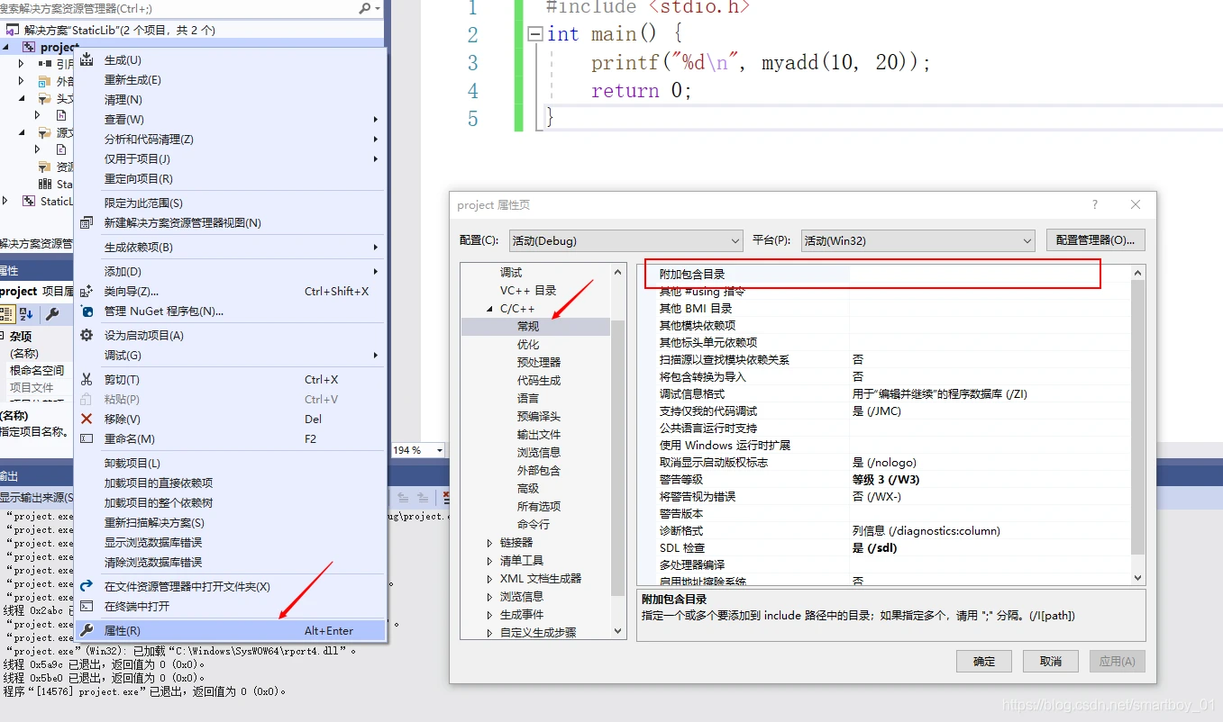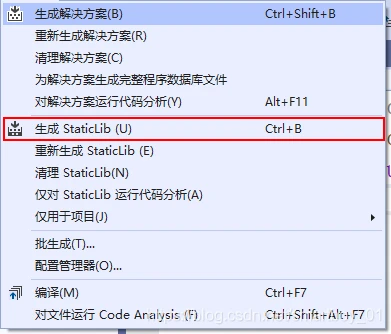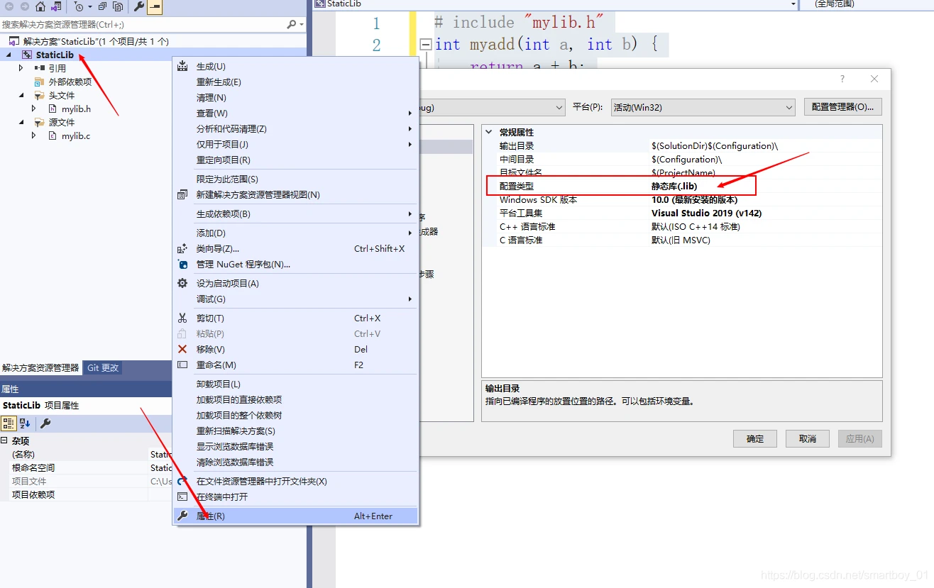 配置项目属性。(右击项目名),因为这是一个静态链接库,所以应在项目属性的“配置属性”下选择“常规”,在其下的配置类型中选择“静态库(.lib)。