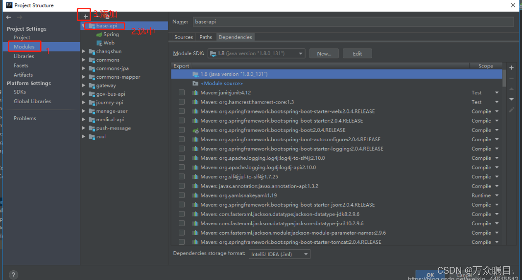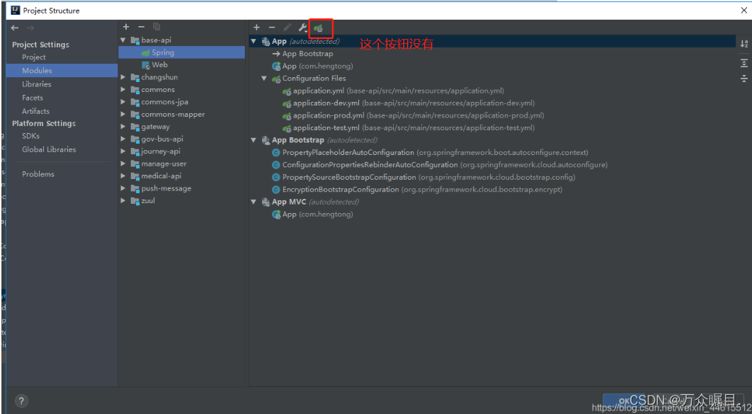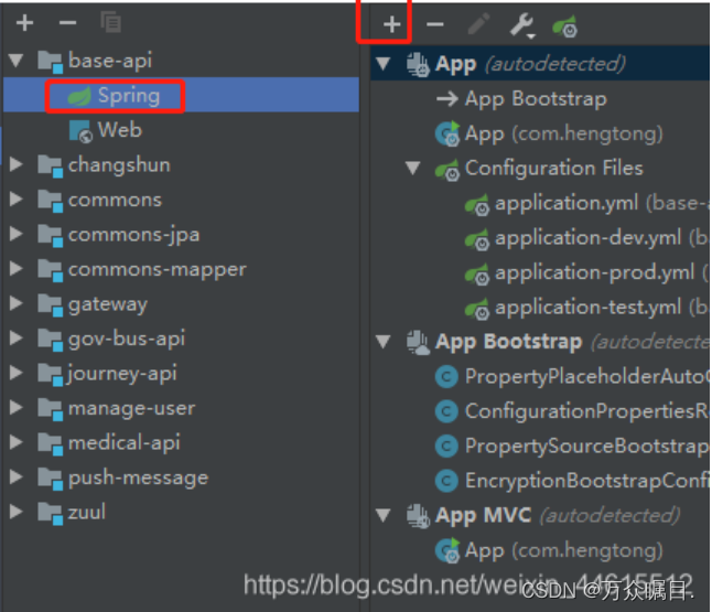 ctrl+shift+alt+s 选择modules 选择项目名称,添加spring
