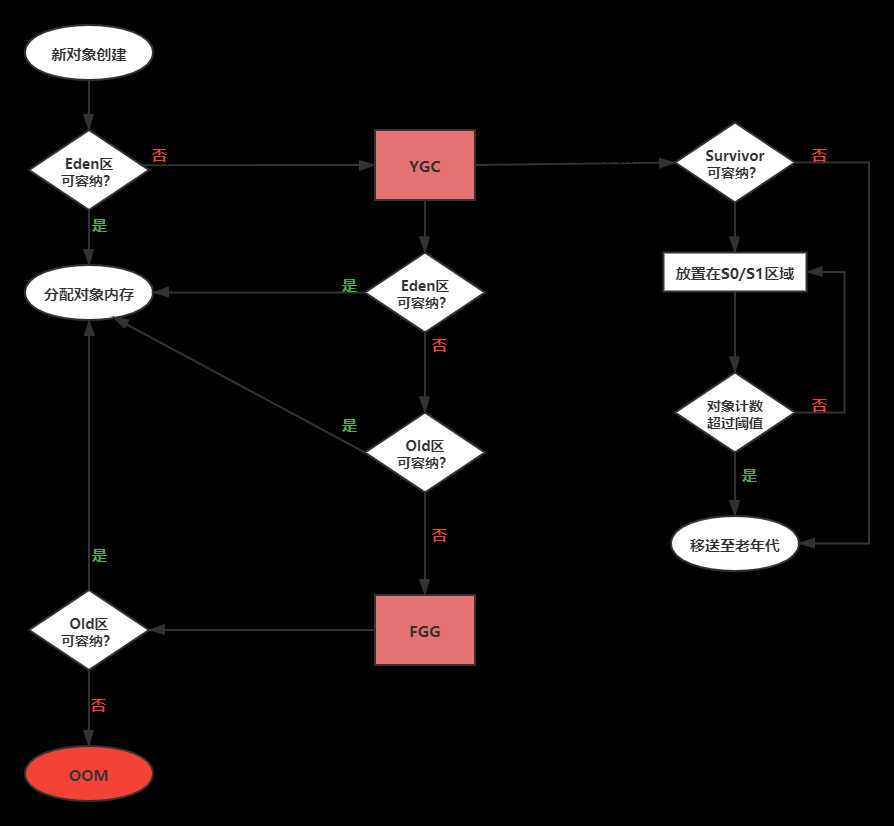 如果Survivor区无法放下,或者创建了一个超大新对象,Eden和Old区都无法存放,就会触发Full Garbage Collection,即FGG,便再尝试放在Old区,如果还是容纳不了,就会抛出OOM异常。在不同的JVM实现及不同的回收机制中,堆内存的划分方式是不一样的。