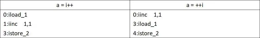 第 1 处说明:局部变量表就像一个快递柜,有着很多的柜子,依次编号为1,2,3,...,n,字节码指令 istore_1 就代表打开了 1 号柜子,再把栈顶中的值 10 存进去。栈就好如一个桶,任何时候只能对桶口的元素进行操作,所以数据只能在栈顶进行存取。部分指令可以直接在柜子里面直接进行,比如 iinc指令,直接对抽屉里的数值进行 +1操作。我们经常遇到的 i++ 和 ++i,通过字节码对比起来,答案一下子就一目了然了。如下表格所示: