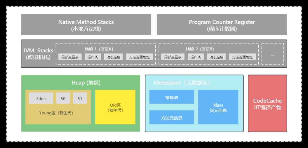 Heap堆区是Java发生OOM(Out Of Memory)故障的地方,堆中存储着我们平时创建的实例对象,最终这些不再使用的对象会被垃圾收集器回收掉,而且堆是线程共享的。一般情况下,堆所占用的内存空间是JVM内存区域中最大的,我们在平时编码中,创建对象如果不加以克制,内存空间也会被耗尽。