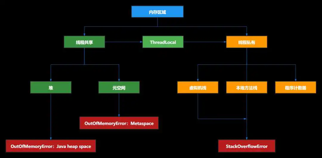 最后,从线程的角度来看,堆和元空间是所有线程共享的,而虚拟机栈、本地方法栈、程序计数器是线程内部私有的,我们以线程的角度再来看看Java的内存结构图: