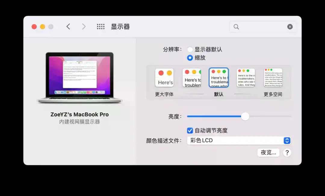 Mac可以在系统偏好设置里的显示器里,找到分辨率的缩放功能: