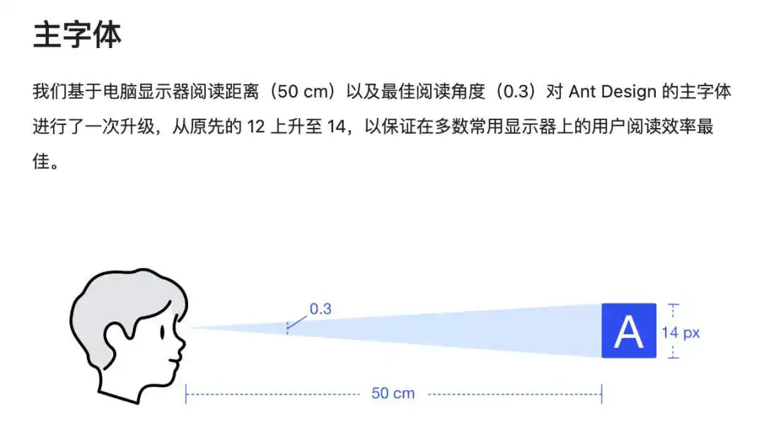 下图是 Ant Design 官网给出的图示,可见他们之前定字号是 12px,后来才加上来。