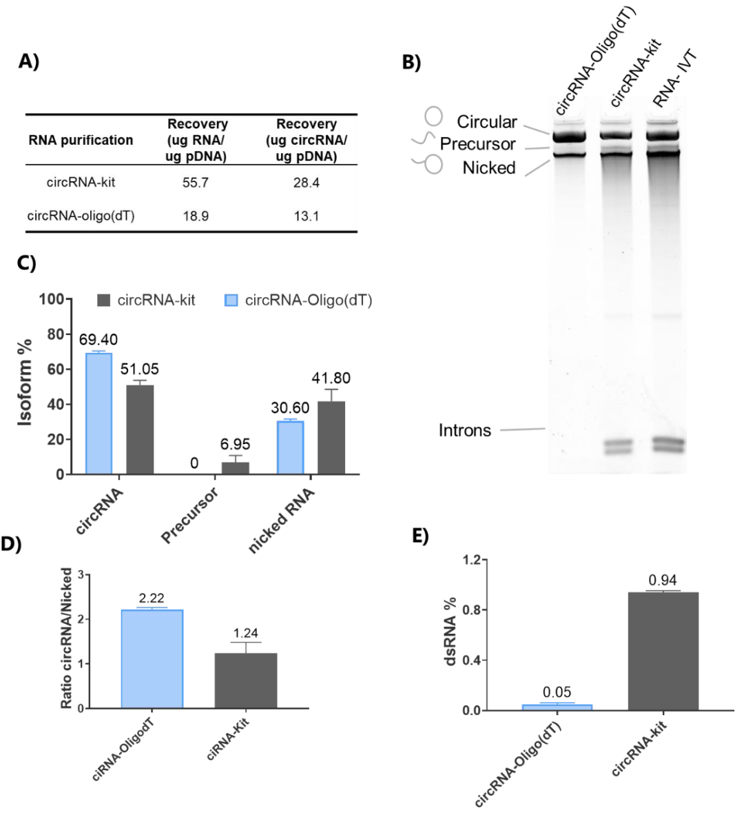 circRNA/nicked RNA 比值是表征 circRNA 纯度重要的参数。Oligo(dT)25 亲和层析回收产物的 circRNA/nicked RNA 比值是 kit 试剂盒纯化回收产物的 2 倍多。