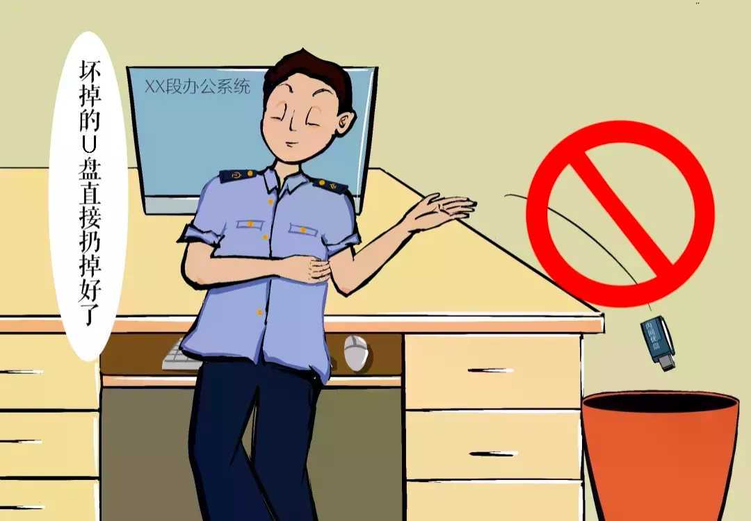🔺常见错误情形:一是故障电脑擅自找外部单位维修处理;二是报废和闲置的电脑、U盘等随意丢弃。