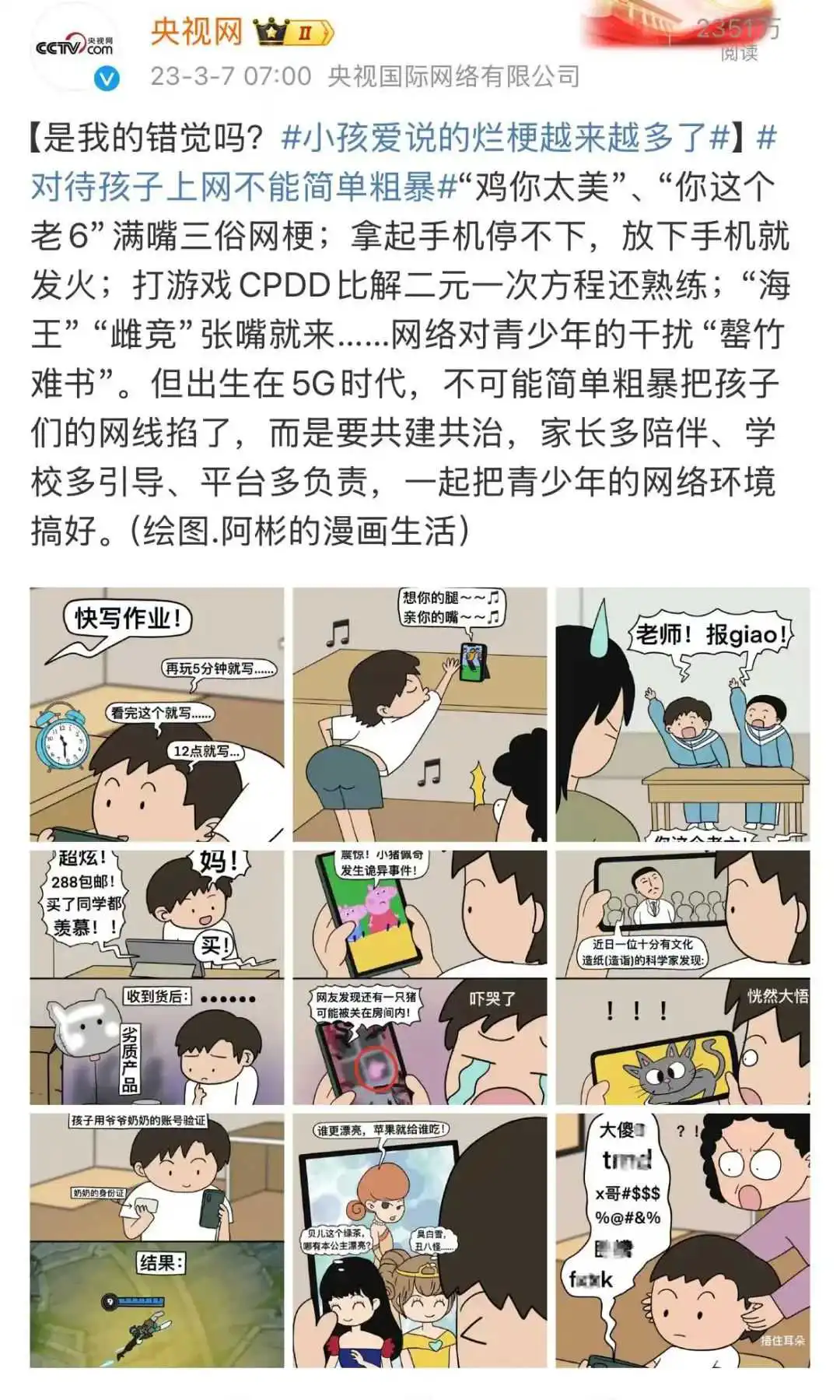 近日,武汉市一小学语文教师周果(化名)在批改学生小朗(化名)的作文时,看到这句话,既生气又无奈。周果叫来小朗询问情况,孩子还理直气壮地表示:同学们交流时经常这样说。
