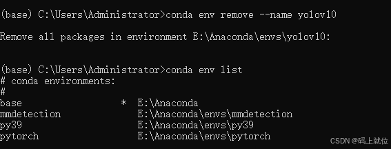 然后再输入 conda env list 检查是否删除了指定的虚拟环境
