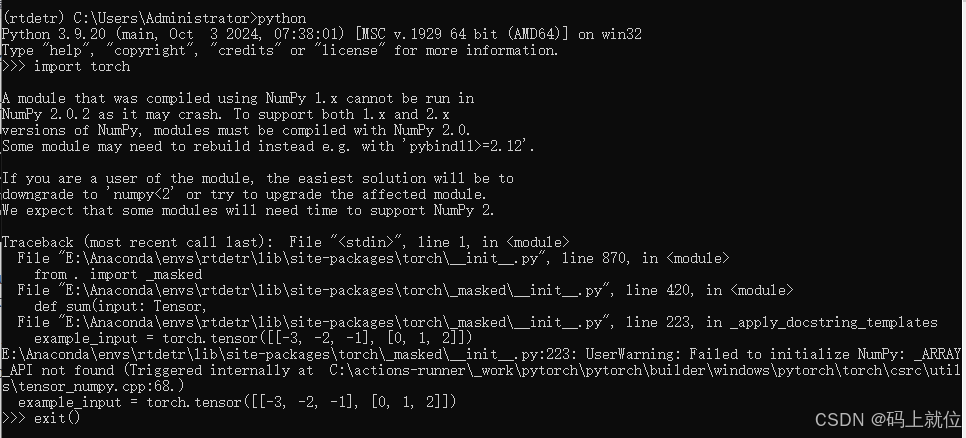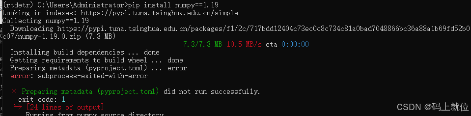 经过查询才知道,是此时默认安装的Numpy版本不匹配,默认安装的是2.0.2,我查阅资料告诉我要用1.19.x - 1.21.x。于是我把原来的Numpy卸载,安装了1.19版本的,但还是报错,如下: