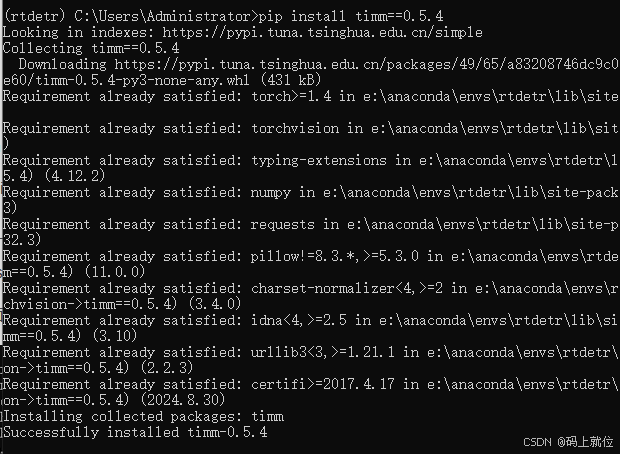 再然后,就需要安装RT-DETR所需的timm库,为了避免兼容性问题,请大家安装0.5.4这个版本,我已经试过,成功安装