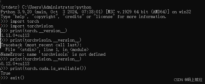 下面要注意,我本来以为到这里就完成了对torch、cuda的安装,但是当我进行验证时却报错