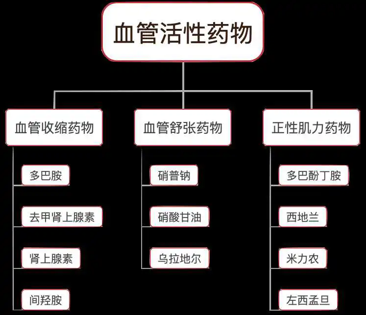 以药物主要临床作用为依据,将血管活性药物分为血管收缩药、血管扩张药和正性肌力药三类(如图 1)。