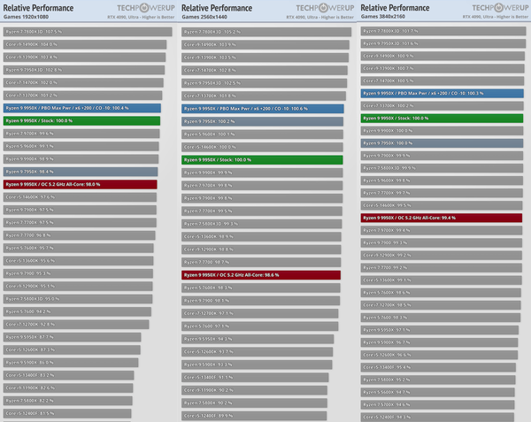 从左到右依次是1080P/2K/4K分辨率下,CPU游戏性能排名,测试显卡均为4090,目前最强游戏U为7800X3D。