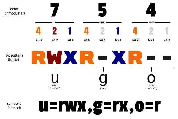 Linux/Unix 的文件调用权限分为三级 : 文件所有者(Owner)、用户组(Group)、其它用户(Other Users)。