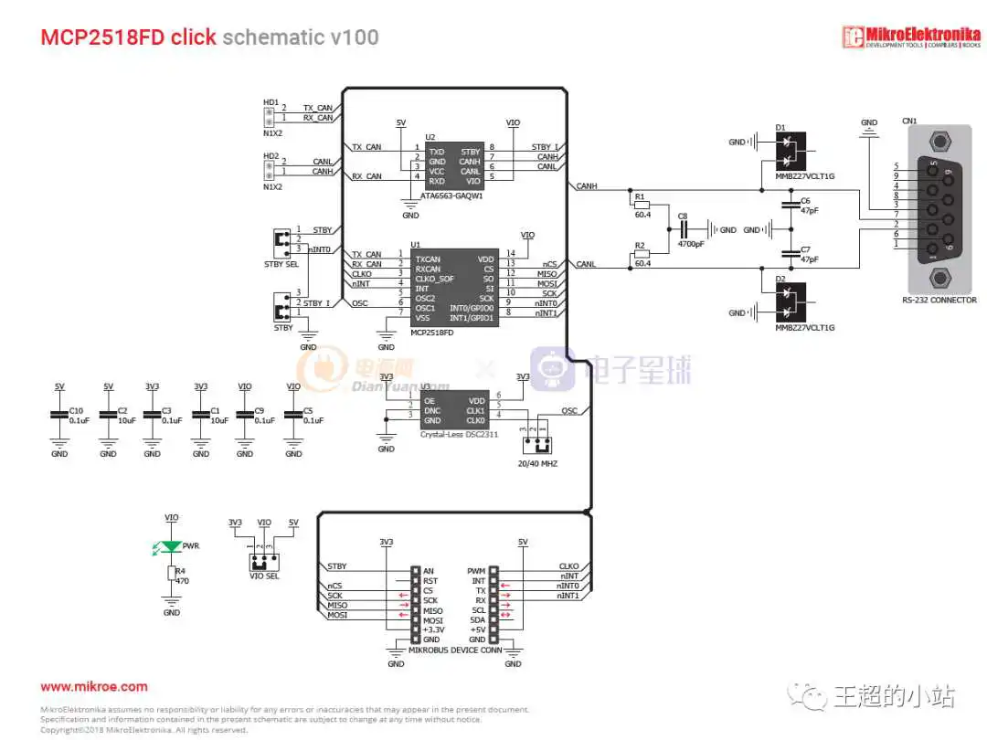 MIKROE公司提供的MCP2518FD CLICK板可用于快速评估该方案,其原理图如下。