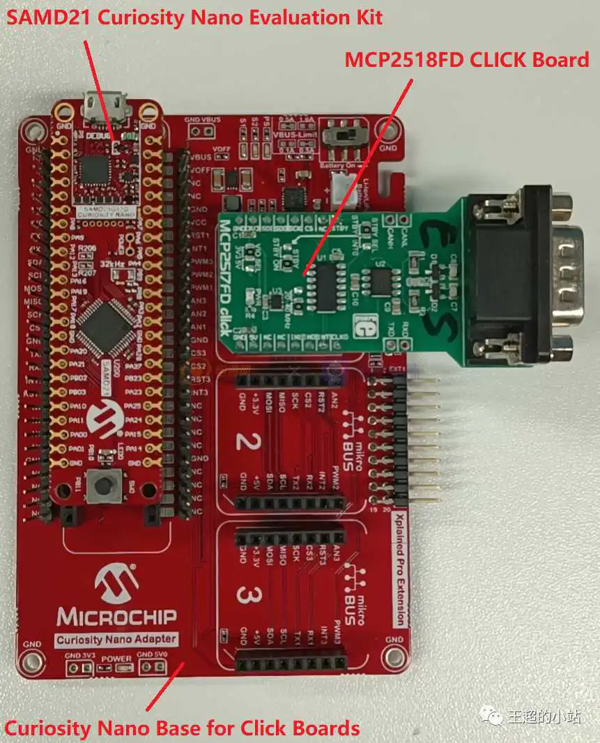 本文的实验验证基于如下开发套件,借助32bit Coretx-M0+ MCU ATSAMD21G17D通过SPI操作MCP2517FD实现MCU的CAN/CAN FD接口扩展。因我这里没有MCP2518FD Click板,只找到MCP2517FD的,但是MCP251xFD可共用驱动API程序,因此对于文章脉络没有影响,所以下文提及时仍说MCP2518FD。请大家参见如下Github链接获得例程源码,上面同时也有基本的软硬件说明及开发环境说明。