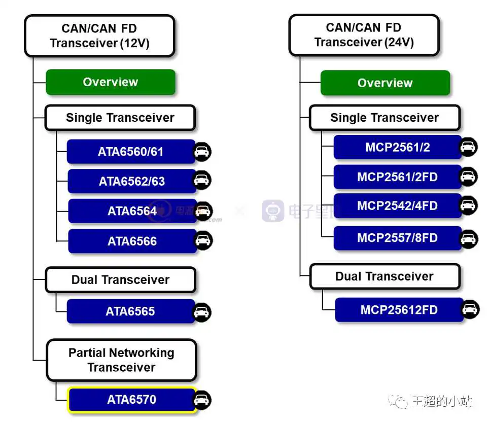 万一不巧在您的项目中MCU没有CAN FD外设或CAN FD外设数量不够,那么此时用MCP2518FD来实现CAN FD功能是个不错的选择(MCP2518FD也支持CAN 2.0B,所以本文后续内容将CAN或CAN FD均简称为CAN),MCP2518FD是一个低成本小封装的CAN控制器,其通过SPI接口与MCU进行通信。在实际应用中,除了CAN控制器MCP2518FD,额外还需一颗CAN收发器和时钟振荡器。对于CAN收发器的选择可以参见下图,且所有收发器均满足车规标准,大家可以根据需要自由选择。对于时钟振荡器,可选择MEMS振荡器DSC60XXB系列,推荐选择40M振荡器。