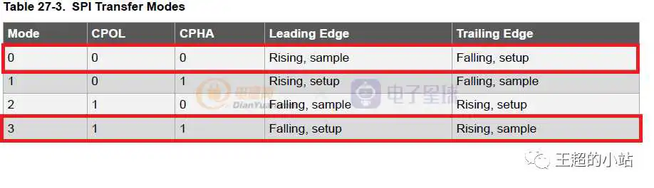 为了更好的理解SPI的模式0和模式3,进一步看下ATSAMD21G17D的Datasheet中对于SPI模式的说明,可以看出MCP2518FD选取的2种模式均是在上升沿实现对输入数据的采样,在下降沿实现对输出数据的改变。这2种模式的差别仅在空闲状态时时钟信号的状态,模式0空闲状态时时时钟信号SCK为低电平,而模式3空闲状态时时钟信号SCK为高电平。