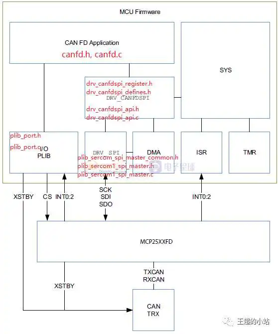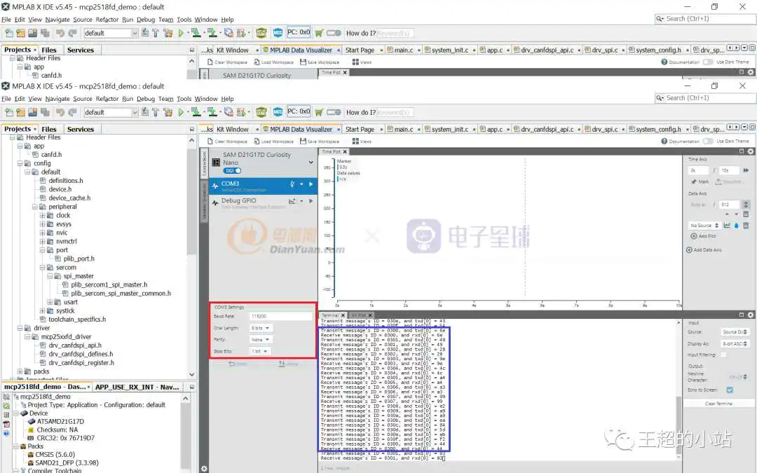 介绍完了硬件平台及软硬件接口情况,我们看下示例工程软件的代码结构示意图。其中“CAN FD Application”层为应用程序,包括MCP2518FD的初始化程序和测试程序,测试程序为自己先发一帧数据后通过外部环回模式接收该帧数据,因为我没有2个节点,所以通过外部环回模式完成测试。“DRV_CANFDSPI”层为MCP2518FD不局限于具体MCU的驱动层,这四个文件保持固定即可。“DRV_SPI”和“I/O PLIB”层为MCU硬件驱动层,直接驱动MCU SPI外设和IO。例程代码除了“CAN FD Application”和“DRV_CANFDSPI”层的共6个.c和.h文件外其他工程代码全部为MAPLAB X IDE的Harmony v3环境配置生成的。