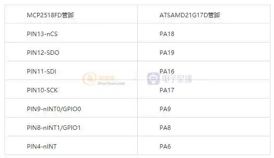 ATSAMD21G17D和MCP2518FD的软硬件接口表如下。