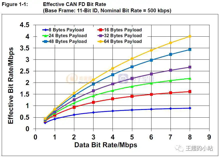 下图显示由于较高的数据比特率和每帧增加的数据字节而可能增加的有效比特率,该图使用的CAN FD为11位标识符标准帧,借此大家可直观的体会CAN FD如何增加CAN总线的带宽。