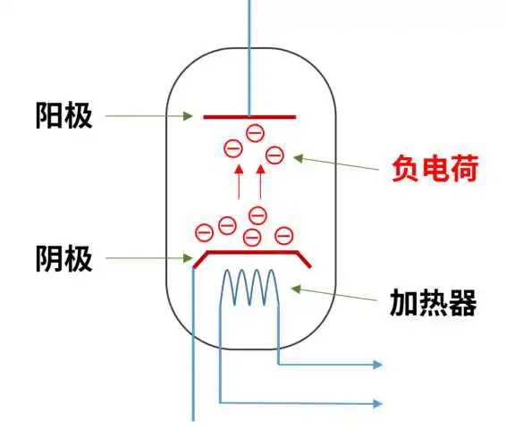 弗莱明的二极管,结构其实非常简单,就是真空玻璃灯泡里,塞了两个极:一个阴极(Cathode),加热后可以发射电子(阴极射线);一个阳极(Anode),可以接收电子。