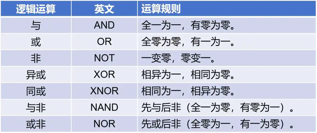 计算机只认识0和1。它进行计算,就是基于这些逻辑运算规则。
