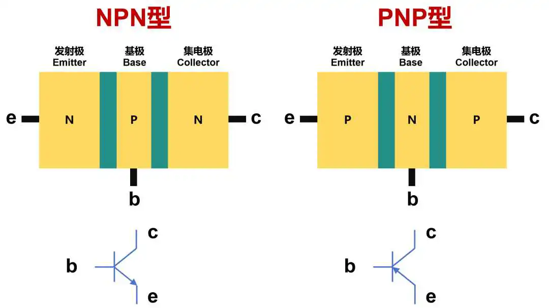 BJT晶体管有NPN和PNP两种结构形式: