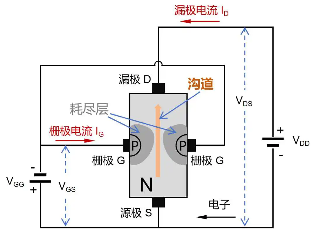 JFET的工作原理,简单来说,就是通过控制栅极G和源极S之间的电压(图中VGS),以及漏极D和源极S之间的电压(图中VDS),从而控制栅极和沟道之间的PN结,进而控制耗尽层。