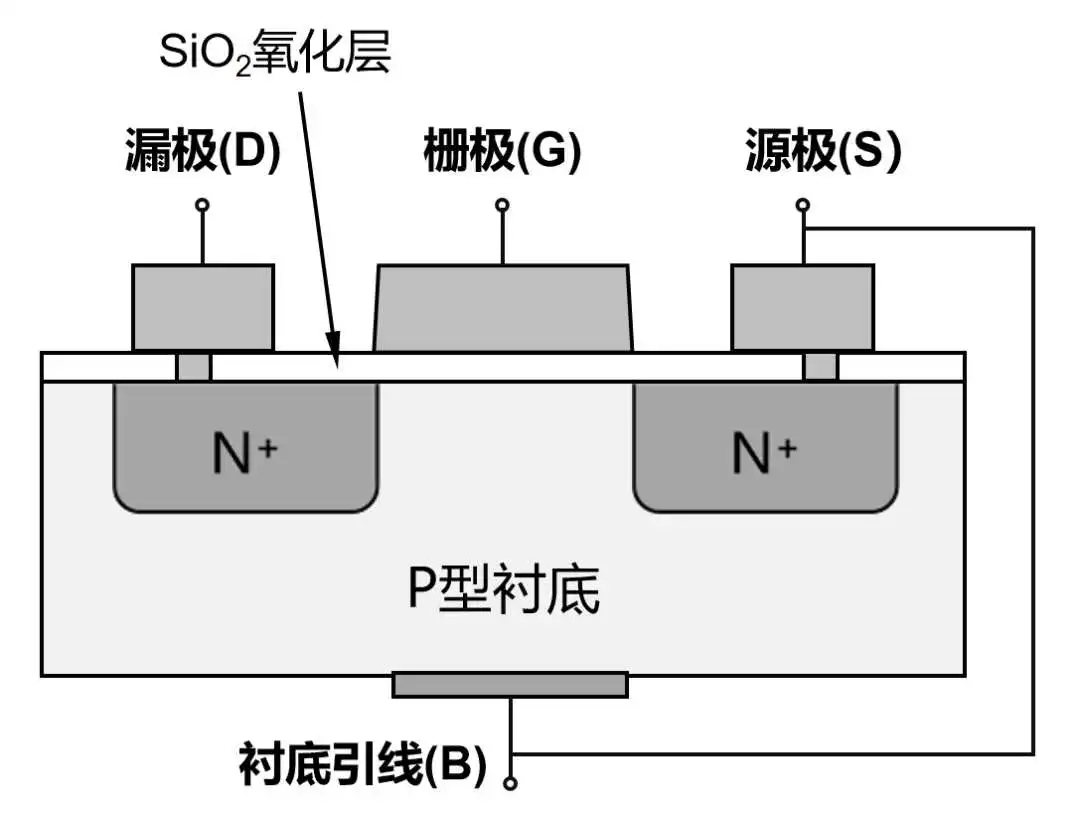 P型硅衬底有一个端子(B),通过引线和源极S相连。