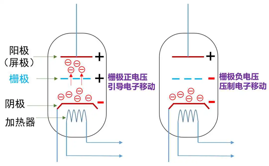如果栅极的电压为负,阴极上的电子就没有动力前往栅极,更不会到达阳极。