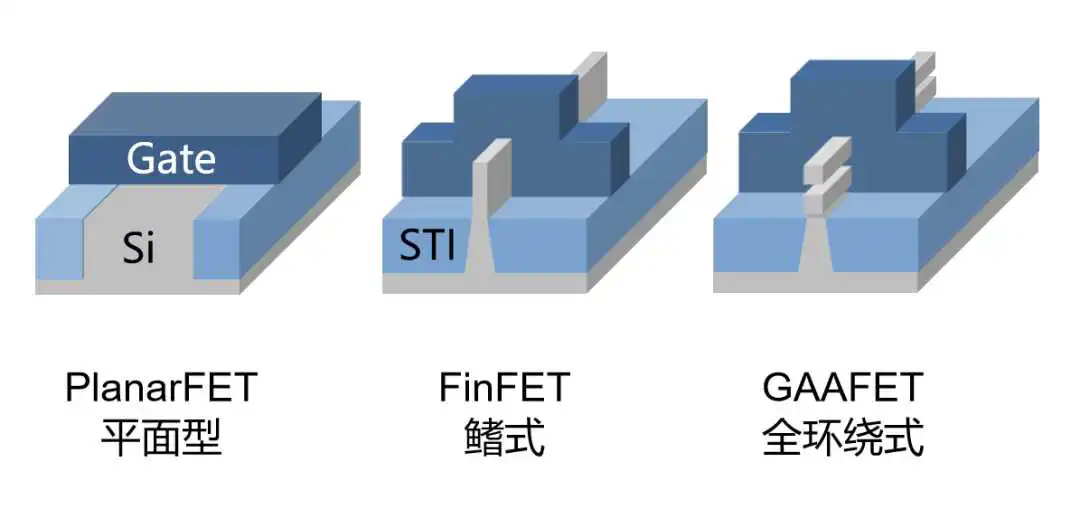 技术继续演进,等到了5nm时,FinFET也不行了。这时,又有了GAAFET(环绕式栅极技术晶体管)。