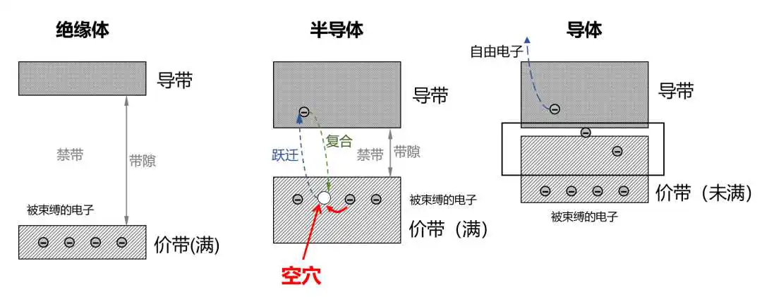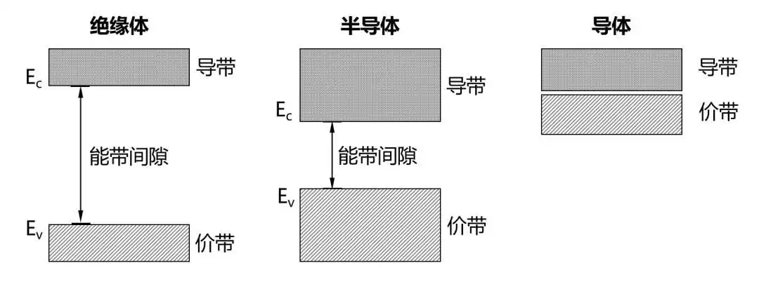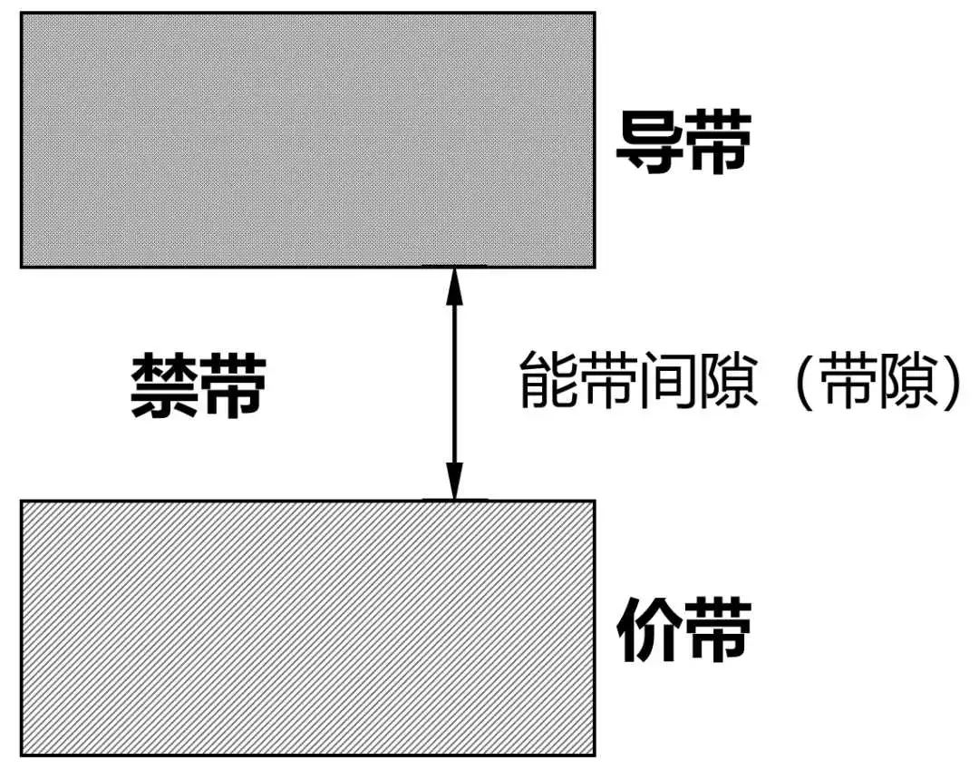 在两个能带中,处于下方的是价带,上方的是导带,中间的是禁带。价带和导带之间是禁带。禁带的距离,是带隙(能带间隙)。