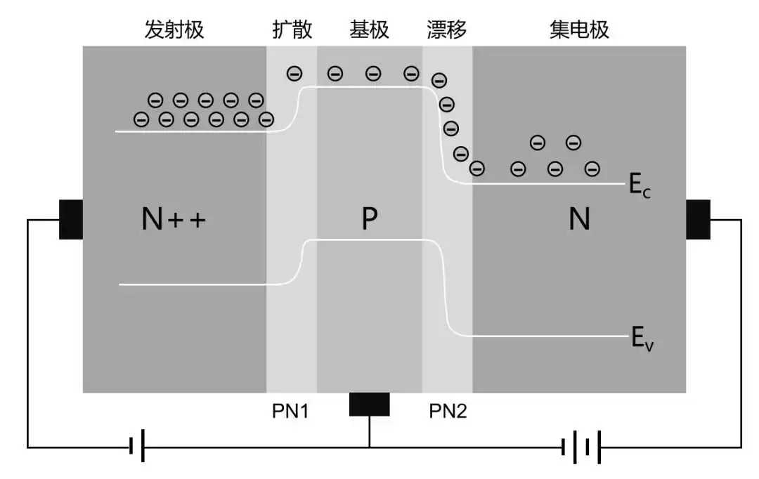 我们可以看出,BJT晶体管是在一块半导体基片上,制作两个相距很近的PN结。两个PN结把整块半导体分成三部分,中间部分是基极(Base),两侧部分是发射极(Emitter)和集电极(Collector)。